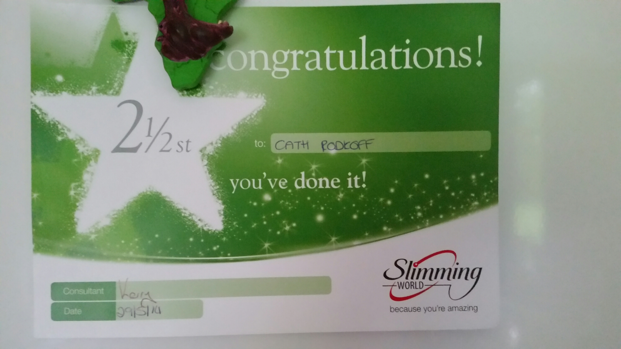 And more great news at Slimming World! In the week where I saw my niece for the first time in a few weeks to be greeted with “Auntie Cath! How much weight have you lost? I can really tell”, and also where I was punching the air in the changing room when trying on the dress for my friend’s hen party, and had to ask the assistant to find me the dress in a smaller size! Yes, I’ve also had a 2 pound loss, giving me my 2.5 stone award, and 36 pounds in total. I am stoked!